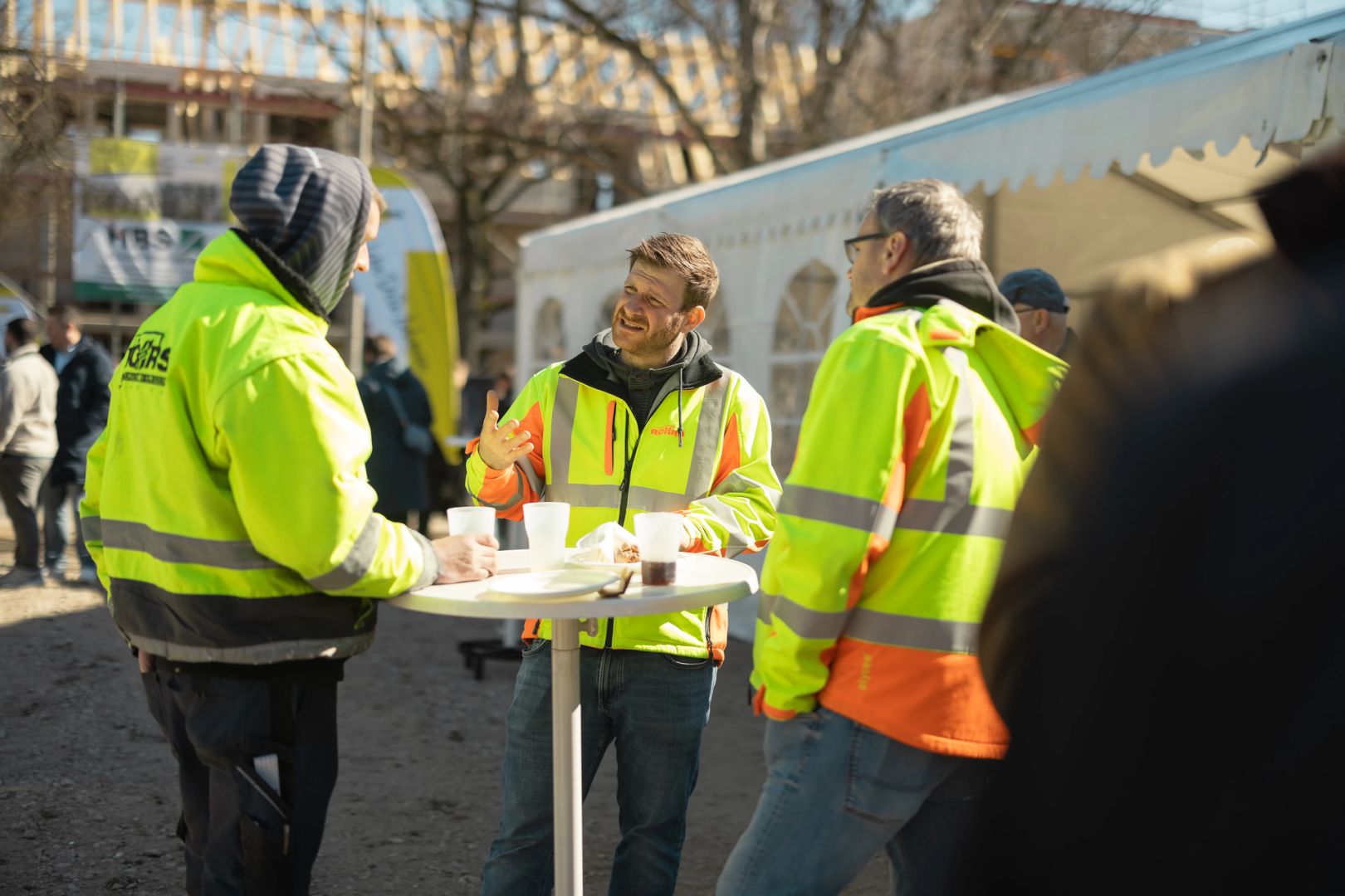Für die feierliche Rede beim Richtfest stieg spar+bau-Vorstand Rainer Detjen auf das Gerüst des Rohbaus und bedankte sich herzlich bei allen Beteiligten. Detjen lobte den reibungslosen Baufortschritt und den gelungenen Entwurf: „Grundlegende Idee des Gebäudes ist die Laubengangerschließung, sodass dort Kommunikationsflächen entstehen. Denn das ist es ja, was eine Genossenschaft ausmacht: das Gemeinsame, das Miteinander, das Zueinanderfinden.“